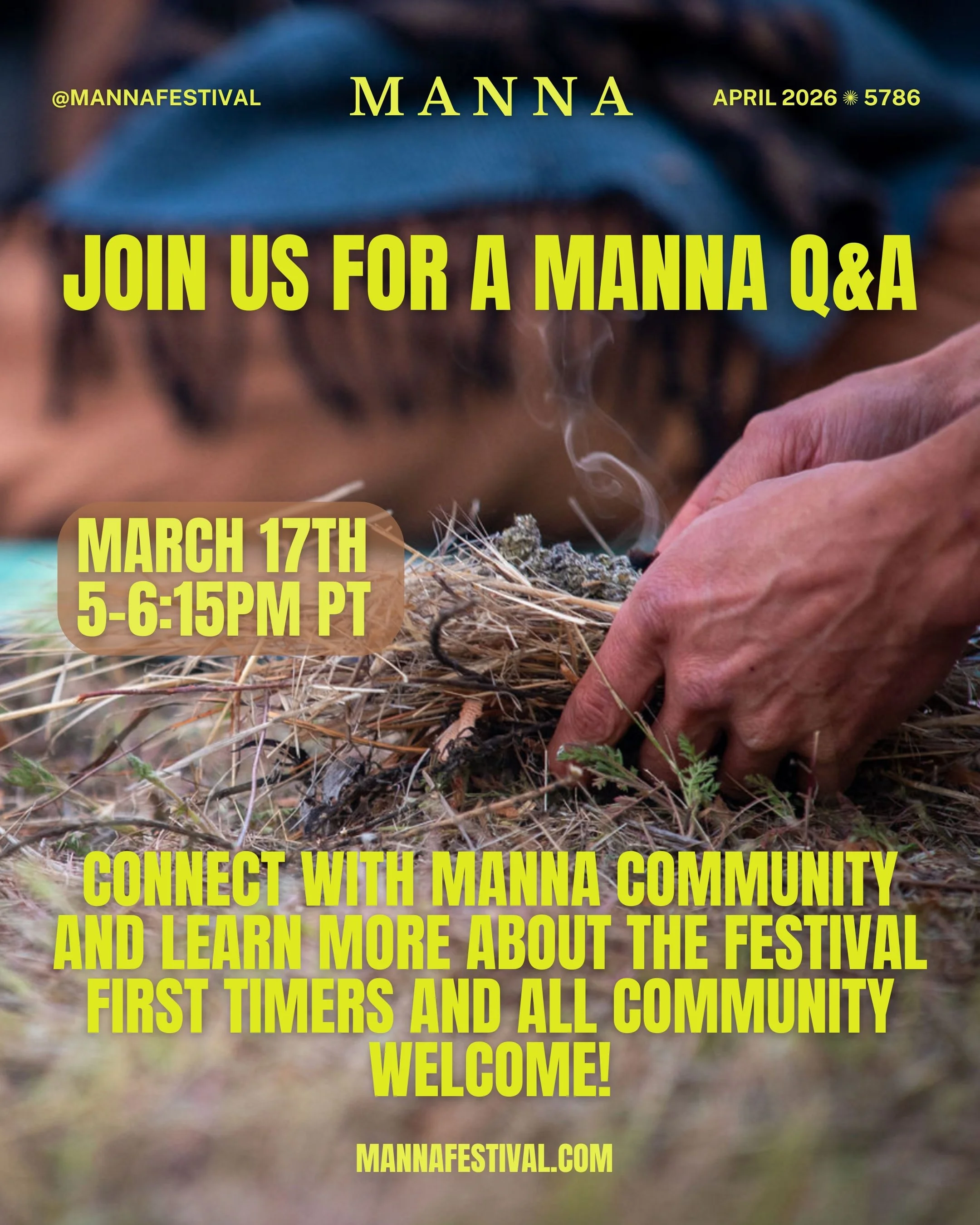 Join MANNA Co-Directors Ariella Powers + Daniel Schindelman Schoen (along with other MANNA leaders) to learn more about the upcoming MANNA (post) Passover Pilgrimage Festival. We will plug ourselves into the vision and inspiration behind the gathering, create a space for dialogue and connection, and answer your questions. Free and open to all!